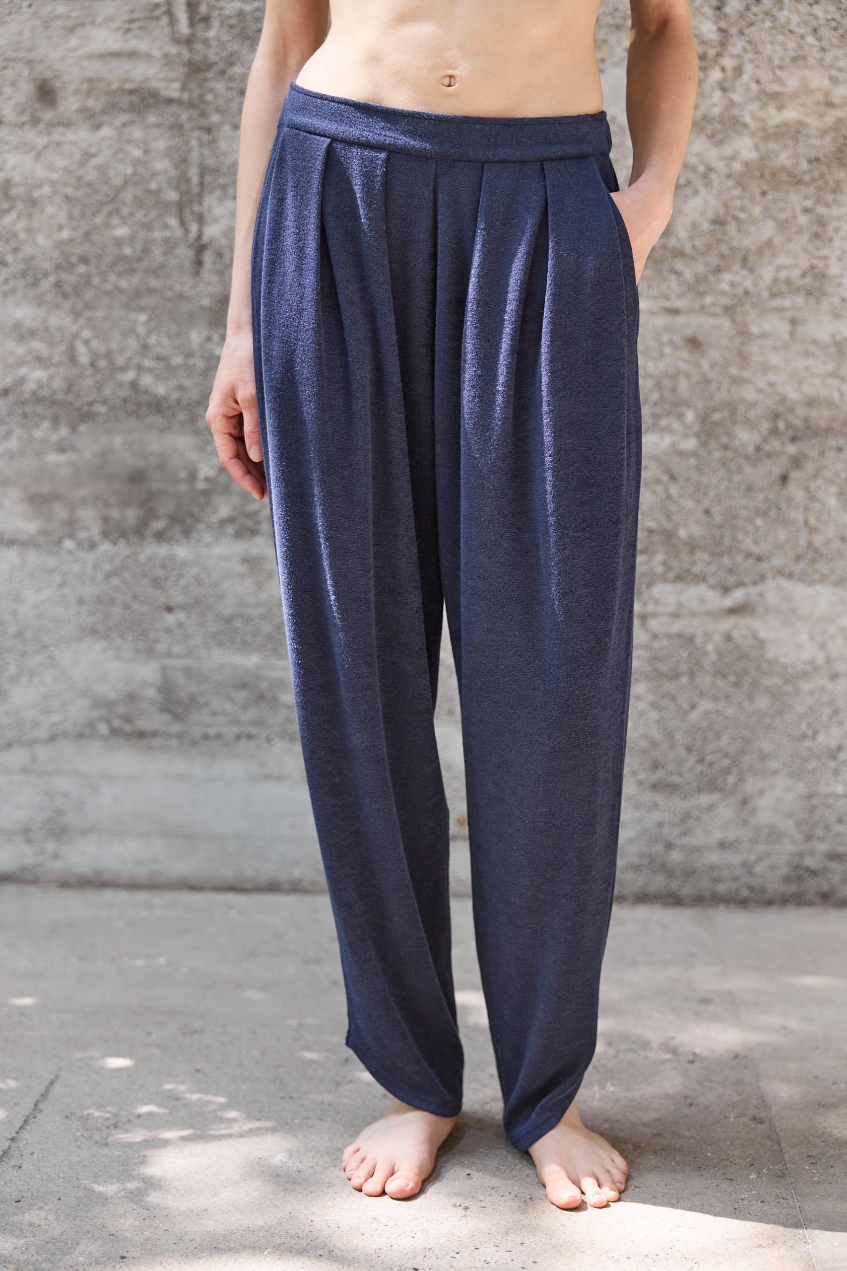 Zoals een geklede pantalon met plooien, zijzakken en een elastische tailleband — maar dan als comfortabele slaapbroek in het zachtste materiaal. Dat is de nieuwe MAGGIE broek van SUNDAY IN BED.