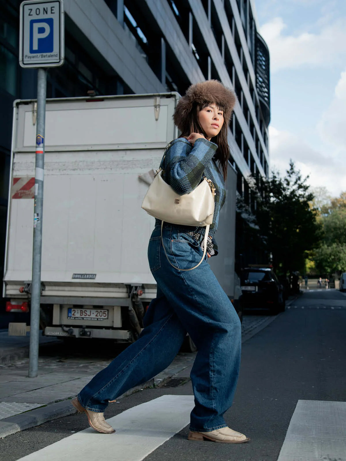 Hoewel ruim, behoudt de tas een strakke, architecturale vorm. Hij kan in de hand worden gedragen met het geïntegreerde handvat of crossbody/over de schouder dankzij de afneembare en verstelbare riem.