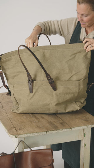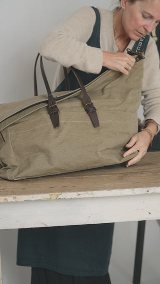 Gemaakt uit stonewashed katoenen canvas, weerbestendig en stevig, met details in plantaardig gelooid leder. Een tas die tegen een stootje kan, én gezien mag worden.