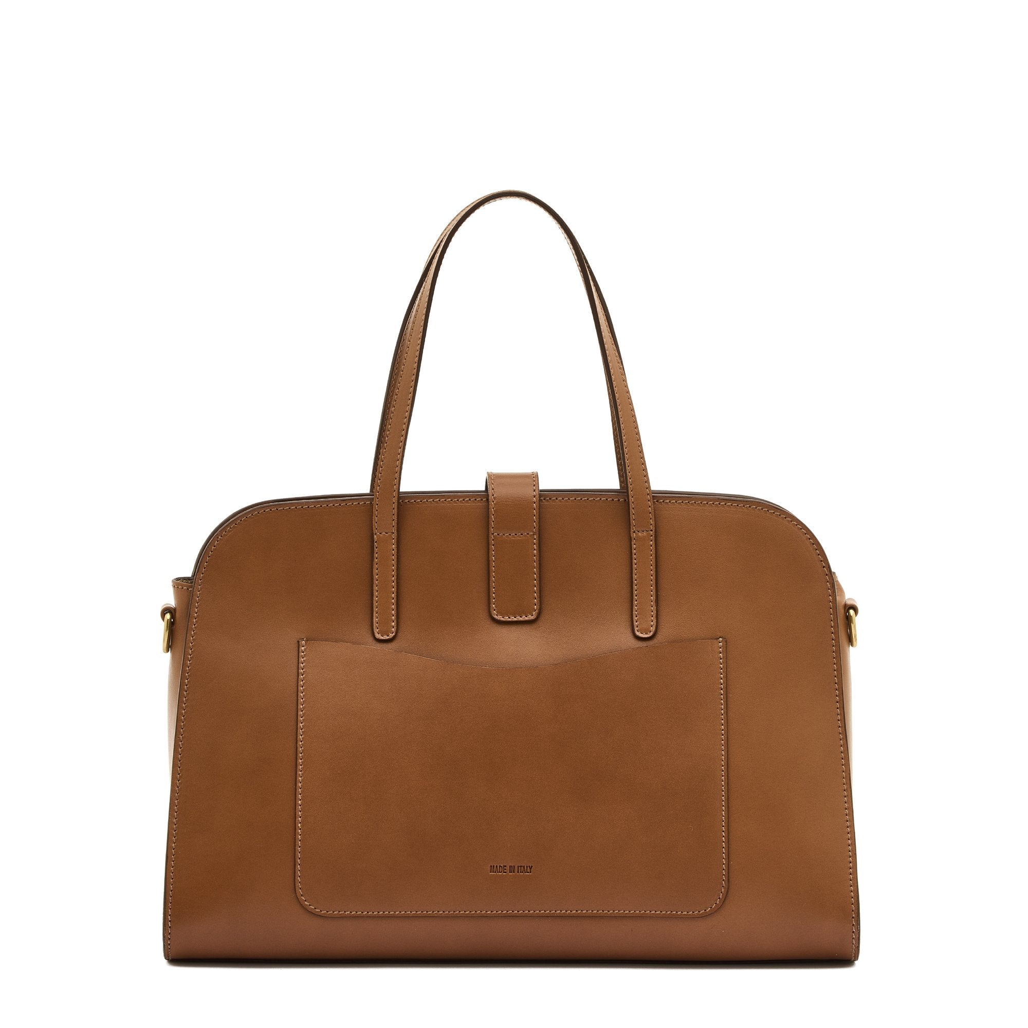 Dameshandtas van soepel, plantaardig gelooid leer. Elegant en veelzijdig, ook als crossbody te dragen dankzij de verstelbare riem met gesp en afneembare haken. Messing sluiting met gebogen magnetische drukknoop. Hoofdritssluiting, suède voering en achtervak met iconische golvende contour. 100% gemaakt in Italië.